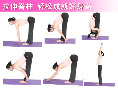 增高是很多个子不高的朋友的梦想,如何能够快速增高呢?小编今天教你一个能够轻松有效增高的秘诀。那就是增高瑜伽——增延脊柱式。它的前屈位不仅锻炼了我们的腹部肌肉,更重要的是拉伸了我们的脊柱。通过坚持做这个动作,经常锻炼我们的脊柱,能够有效地把它拉伸,把身高“拉长”哦!1)双脚并拢,抬举双手并高举过头,呼气,双手打开与肩同宽,带动身体,身体往前,往下。2)指尖触地,保持抬头状态,双脚绷直。3)然后双手抓...