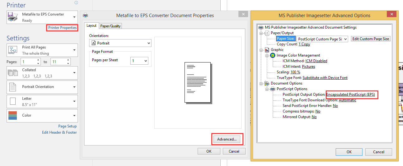 Select the 'Metafile to EPS Converter' printer, then click 'Printer Properties' button. In the opened window, click 'Advanced' button, to make sure the PostScrip Output Option is EPS