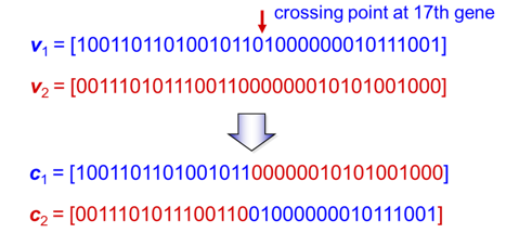 交叉遗传是指交换两个个体的部分DNA,形成新的个体。如下图所示,两个个体v1和v2在第17个位置之后的部分交换后,得到新的个体c1和c2。