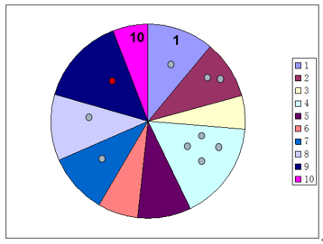 选择操作从一个群体中,选择一定数目的个体。个体被选择的概率正比于个体适应环境的程度。也就是说,若个体更适应环境,则被选择的概率越大。这相当于乐透游戏(Roulette Game),如下图所示,在一个转盘中有很多区域,每个区域的面积表示适应程度,随机旋转这个转盘,面积越大的区域指向某个区域的概率越大。