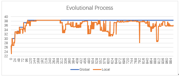 结果的进化过程如下所示,其中Local表示单代最优适应度随着代数的变化,Global表示全局适应度随着代数的变化。