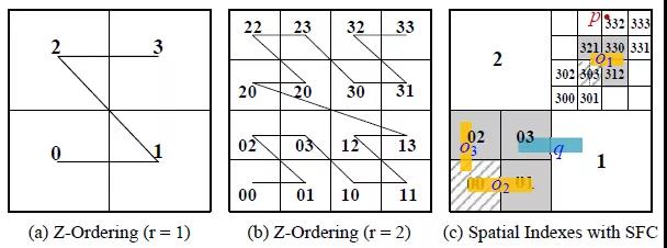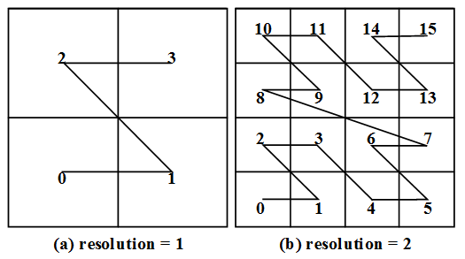 图7 XZ-Ordering最大分辨率为2时的编码四、总结空间填充曲线将多维数据转换到一维整数域上,并且尽可能保持了多维空间的特性,使得空间相近的空间在转换后的整数上也尽可能地相近。Z曲线和Hibert曲线是较为常用的空间填充曲线,其中Z曲线较容易实现。XZ-Ordering扩展了Z曲线,使得它能较好地表示非点空间对象,如线和多边形对象。 参考文献[1] https://www.geomesa.org/[2] http://just.urban-computing.com/[3] Ruiyuan Li, Huajun He, RubinWang, Yuchuan Huang, Junwen Liu, Sijie Ruan, Tianfu He, Jie Bao, and Yu Zheng.2020. Just: Jd urban spatio-temporal data engine. In 2020 IEEE 36thInternational Conference on Data Engineering (ICDE). IEEE, 1558–1569.[4] Tetsuo Asano, Desh Ranjan,Thomas Roos, Emo Welzl, and Peter Widmayer. 1997. Space-filling curves andtheir use in the design of geometric data structures. Theoretical ComputerScience 181, 1 (1997), 3–15.[5] https://en.wikipedia.org/wiki/Space-filling_curve[6] https://baike.baidu.com/item/%E5%B8%8C%E5%B0%94%E4%BC%AF%E7%89%B9%E6%9B%B2%E7%BA%BF/938155?fr=aladdin[7] ChristianBöhm, Gerald Klump, and Hans-Peter Kriegel. 1999. XZ-Ordering: A Space-FillingCurve for Objects with Spatial Extension. In Proceedings of the 6thInternational Symposium on Advances in Spatial Databases (SSD '99).Springer-Verlag, Berlin, Heidelberg, 75–90.