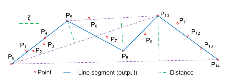 Douglas-Peucker algorithm is an error bounded sequence simplication. It is used for compressing trajectory, roadnetwork, etc. It's main idea can be shown as the following picture [1].I implement t...