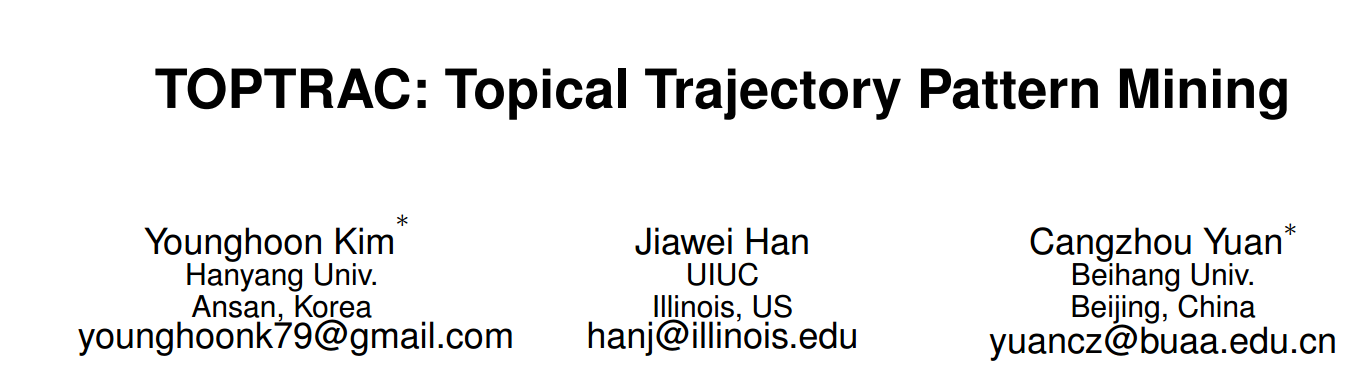 今天分享一篇论文:Kim Y, Han J, Yuan C. TOPTRAC: Topical Trajectory Pattern Mining[C]//Proceedings of the 21th ACM SIGKDD International Conference on Knowledge Discovery and Data Mining. ACM, 2015: 587-596.第二作...