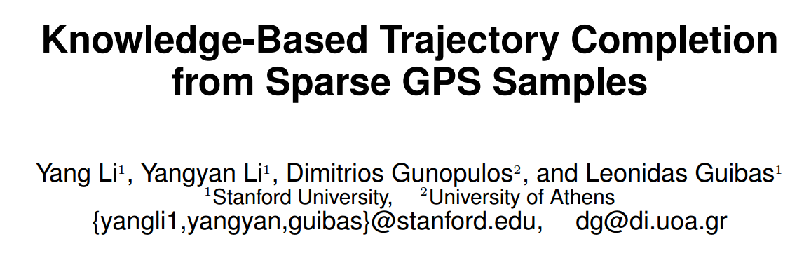 Li Y, Li Y, Gunopulos D, et al. Knowledge-based trajectory completion from sparse GPS samples[C]//Proceedings of the 24th ACM SIGSPATIAL International Conference on Advances in Geographic Information ...