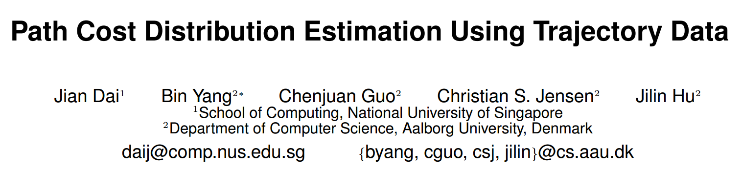 Dai J, Yang B, Guo C, et al. Path cost distribution estimation using trajectory data[J]. Proceedings of the VLDB Endowment, 2016, 10(3): 85-96.论文下载地址:http://pan.baidu.com/s/1pLTRrfH 这篇论文的第四作者Christian...