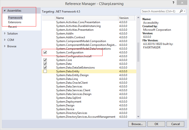 右键references->add references->assemblies下的framework->勾选System.Configuration->ok