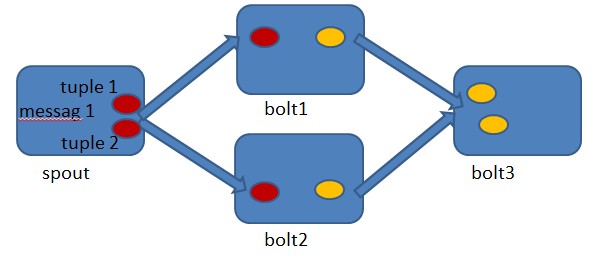 首先来看一下什么叫做记录级容错?storm允许用户在spout中发射一个新的源tuple时为其指定一个message id, 这个message id可以是任意的object对象。多个源tuple可以共用一个message id,表示这多个源 tuple对用户来说是同一个消息单元。storm中记录级容错的意思是说,storm会告知用户每一个消息单元是否在指定时间内被完全处理了。那什么叫做完全处理呢,就是该message id绑定的源tuple及由该源tuple后续生成的tuple经过了topology中每一个应该到达的bolt的处理。举个例子。在下图中,在spout由message 1绑定的tuple1和tuple2经过了bolt1和bolt2的处理生成两个新的tuple,并最终都流向了bolt3。当这个过程完成处理完时,称message 1被完全处理了。