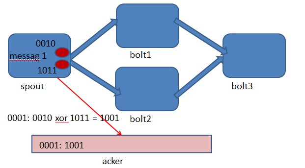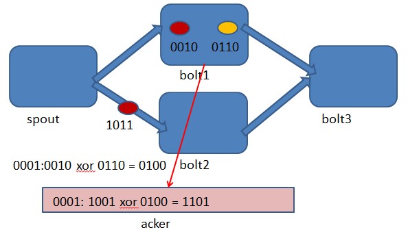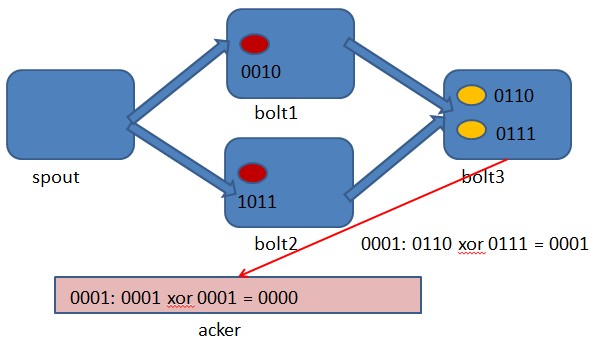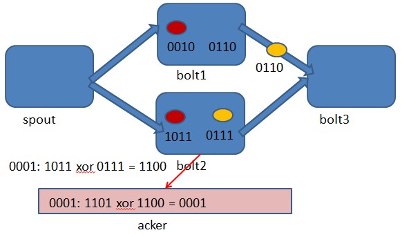 storm中使用的巧妙方法就是基于这个定理。具体过程是这样的:在spout中系统会为用户指定的message id生成一个对应的64位整数,作为一个root id。root id会传递给acker及后续的bolt作为该消息单元的唯一标识。同时无论是spout还是bolt每次新生成一个tuple的时候,都会赋予该tuple一个64位的整数的id。Spout发射完某个message id对应的源tuple之后,会告知acker自己发射的root id及生成的那些源tuple的id。而bolt呢,每次接受到一个输入tuple处理完之后,也会告知acker自己处理的输入tuple的id及新生成的那些tuple的id。Acker只需要对这些id做一个简单的异或运算,就能判断出该root id对应的消息单元是否处理完成了。下面通过一个图示来说明这个过程。