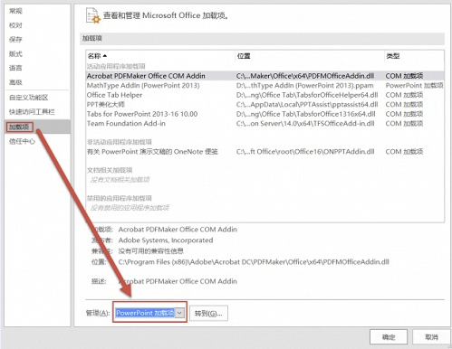2、点击“转到”,出现下图,把Mathtype相关项前面的钩打上,使得Mathtype得以加载即可。