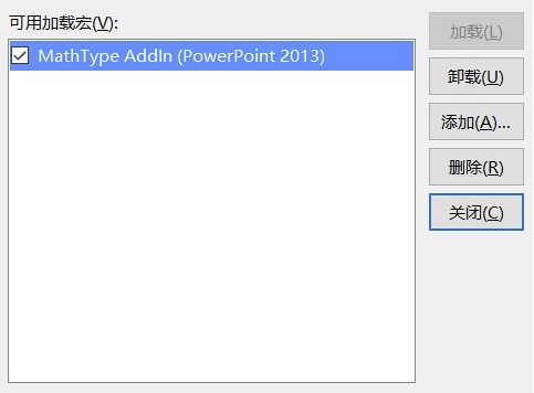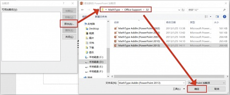 3、若在步骤2中未找到 MathType Addin 加载项,请执行本步骤:添加(A) - 找到 \Office Support\64下的 MathType AddIn (PowerPoint 2013) ,此处32位用户添加\Office Support\32 下的相应文件。