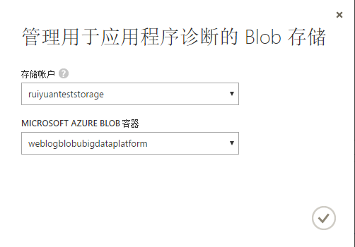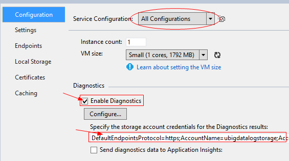 在弹出的配置窗口中,勾选Enable Diagnostics前的复选框,并在方框中输入你的Storage的链接字符串。顺便说一下,这个窗口也能设置Service核大小、程序配置参数。同时,你也可以管理创建多个发布配置文件(下图椭圆框处)