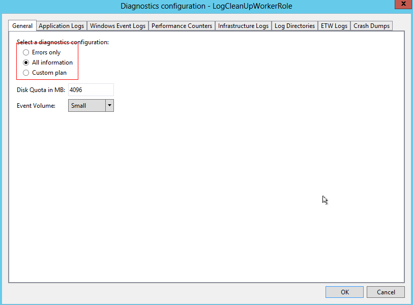 点击上图的Configure按钮,选择日志记录等级。Errors Only表示只记录错误信息,All information表示记录所有的程序信息。还有一些日志大小配额信息,可以只取默认值。