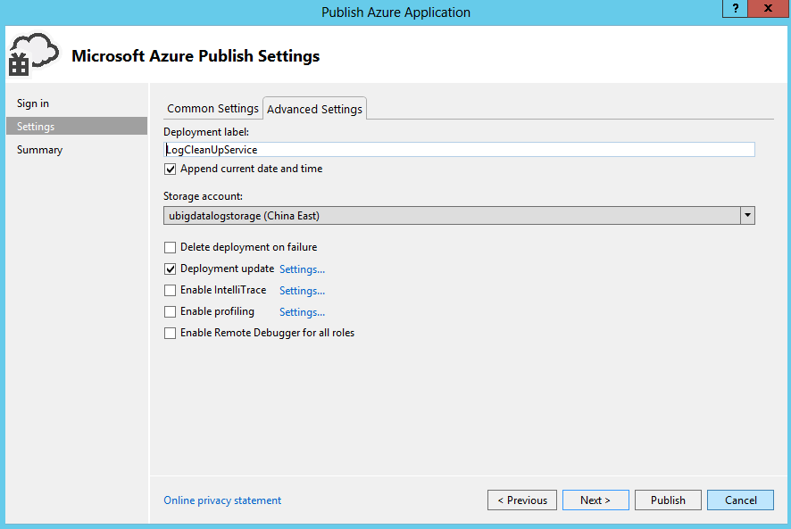 在记录Azure Service日志之前,需要在你的Azure账号下创建一个存储Storage,Azure Service的日志就是存在Storage下的Table中。同时我也假定你已经在Visual Studio中创建了Cloud Service程序了。要想启动Azure Service的日志功能,主要是在发布的时候设置。