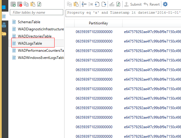 注意Cloud Serivce日志的Partition Key的含义。这个PartitionKey是19位日志产生时间的Ticks,通过这个信息,我们能很快的取到任何时间区间的日志。