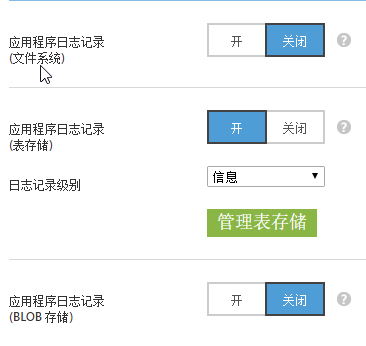 在Azure Potal中进入Azure Web的配置界面,你会看到应用程序诊断区域。可以看到,Azure Web有三种日志记录方案:文件系统、存储表、Blob。不同存储方案有不同的优缺点。表存储更方便程序处理日志,但每条记录长度有限制;而文件系统和Blob存储比较适合人工查看,不限定每条记录的字符长度,Blob存储时,还自带删除旧日志的功能。可以同时打开多个日志记录方案。推荐Blob和Table结合使用