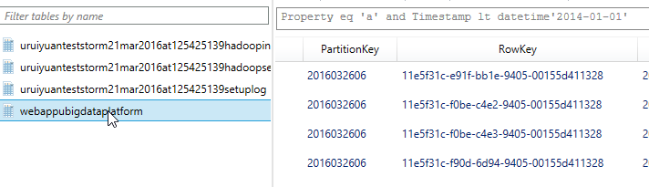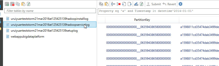 Storm日志的PartitionKey很奇怪,分成两部分,前半部分为0000000000000000000 到 0000000000000000100之间,后半部分是日志产生的Ticks。前半部分的含义询问了Azure的技术团队,仍然没有获得一个比较准确的回答。因此在取得特定时间段的日志时,情况比较复杂,但还是可以获得的,一种方法是取100次,然后再进行时间排序即可。