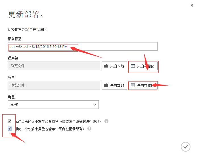 在弹出的框中,设置部署标签(设置后方便知道是否发布成功),选择程序包来自存储区(4步中的cspkg文件),选择配置来自存储区(4步中的cscfg文件),下方两个复选框建议勾选上。