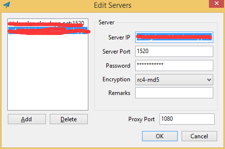 6、下载http://sourceforge.net/projects/shadowsocksgui/files/dist/客户端。解压,运行Shadowsocks.exe。输入对应的信息。注意端口的信息与服务器配置的一致。