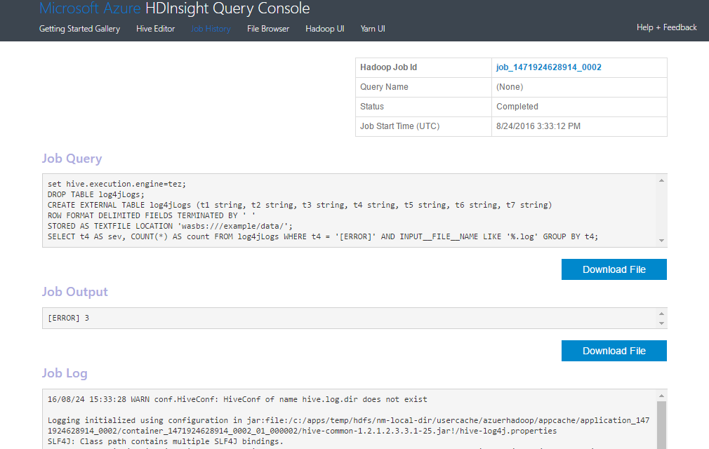 set hive.execution.engine=tez; DROP TABLE log4jLogs; CREATE EXTERNAL TABLE log4jLogs (t1 string, t2 string, t3 string, t4 string, t5 string, t6 string, t7 string) ROW FORMAT DELIMITED FIELDS TERMINATED BY ' ' STORED AS TEXTFILE LOCATION 'wasbs:///example/data/'; SELECT t4 AS sev, COUNT(*) AS count FROM log4jLogs WHERE t4 = '[ERROR]' AND INPUT__FILE__NAME LIKE '%.log' GROUP BY t4;
