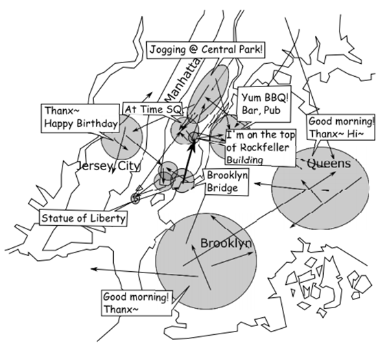 社交网络中,如Twitter、微博,用户经常会发一些带有地理位置的状态。这篇文章主要是从历史轨迹数据(其实是check in的数据)中找出带有语义信息的轨迹模式。这里特定指长度为2的轨迹模式。原文为:To discover semantic trajectory patterns with respect to ‘latent topics’ of geo-tagged messages. 具体方法请看前文的ppt链接。