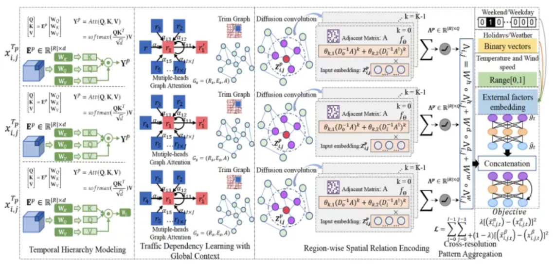 对城市中不同区域间流量的预测,作为智能城市应用平台中非常重要的任务,服务于智能交通系统。比如基于精确的汽车流量预测结果,交通服务平台可以进行实时的交通调度以缓解由于流量过大带来的拥堵。与此同时,及时对未来时刻人流量的预测,可以在一定程度上降低由于人流过大引起踩踏事件的概率。尽管区域间流量的预测在实现城市智能化中起着重要的作用,对复杂的时空流量数据进行准确的建模是一个非常困难的任务。其中需要从时间与空间两个维度出发,对流量数据的动态变化模式进行精确的学习,从而实现对城市区域间流量的精准预测。为了实现更加精确的交通流量预测,我们的研究工作设计了一种基于层级图神经网络的深度学习模型, 分别从时间和空间上对不同区域的流量信息进行建模。具体而言, 我们开发的预测模型基于多粒度的Attention机制, 对不同时间粒度上的流量变化的模式进行自动学习。与此同时, 该研究工作对交通流量在空间维度上的变化模式也进行了建模。不同于现有的方法仅仅只考虑局部的空间关系, 我们从整个城市的全局空间范围学习不同区域间的流量变化的关系。通过层级图神经网络的联合建模学习到全局的空间流量的变化模式以及基于地理位置的空间上下文信息。为了验证模型的有效性, 我们在多个公开数据集上进行了实验。实验结果验证了模型相较于现有流量预测算法的优越性,以实现整个城市不同区域更加精确的流量预测结果。