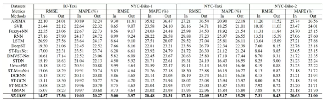 在实际时空数据预测场景中,区域的流量信息在时间维度上呈现出动态的变化模式。为了更加精确地学习流量数据在时间维度上的表示向量,作者通过在不同时间粒度下分别进行特征编码,以获取到不同周期下的流量变化趋势,比如每小时,每天,以及每周的流量波动的规律。针对每一个时间粒度下的流量序列建模,作者采用基于self-attention机制的信息融合模块对历史不同时间区间中流量数据间的关系进行学习。具体而言,在self-attention机制中,通过将输入的表征向量在query, key 和value维度上分别进行特征表示的映射,从而计算出不同时间区间中流量数据点间的关系权重大小。基于学习到的权重值,将时间维度上不同的特征表示进行融合,以实现在不同时间粒度下流量变化模式的学习。与此同时,为了从全局角度对城市不同区域间流量变化的关联性进行学习,作者设计了一种基于Graph Attention网络的表征信息更新模块,用于显式学习区域间流量变化模式的相关性。通过在所构建的区域图中进行基于Attention学习的embedding传递,最后学习到的区域表征向量中潜在地融入了其他相关区域的流量信息,以辅助针对流量信息表征学习的过程。在城市流量预测的任务中,对空间维度上下文信息的刻画也至关重要。在作者所提出的模型框架中,通过设计另一层的图扩散模型对区域间的空间信息进行学习。在构建区域关联图上,我们将具有空间邻接关系的区域,以及在上一层全局Graph Attention中具有较高关联性的区域,生成连接边以构建相应的关联图。基于所构建出来的图结构信息,我们首先生成相应的邻接矩阵,并以此作为基础进行消息的扩散与融合。通过对每个区域的出入流量的表征信息进行传递以及基于邻接矩阵的标准化操作,所学习到的每个区域的表征信息可以在一定程度上反应出基于空间的区域关系信息。因此,通过以上基于时间维度的流量变化建模以及空间上下文信息的融入模块,所提出的模型方案可以实现对流量数据的复杂时空变化模式进行有效的表征学习,对不同时间粒度的表征信息的合并机制,以促进不同粒度下所学习到不同时空模型的融合。该工作中所提出的模型通过在多个数据集上进行了效果的验证实验。所使用到的数据集包括纽约市的出租车、共享单车的流量数据,以及北京市的出租车流量数据。为了更加全面地验证模型的有效性,作者在验证中将其与基于不同架构的现有流量预测方案进行了对比实验。结果如下表所示: