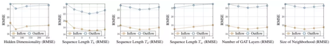 通过对上图结果的观察,我们可以总结出考虑基于三种不同的时间粒度进行时空表征学习刻画出不同周期下流量数据的动态变化模式,从而进一步优化模型的预测效果。通过对所开发模型中关键的超参数的影响进行学习,可以有助于更好地理解模型。如下图所示,我们可以观察到在不同的参数设置下,模型的预测效果。比如较大的表征维度可能会造成模型的过拟合,以及较长的流量序列会在一定程度上引入噪音。