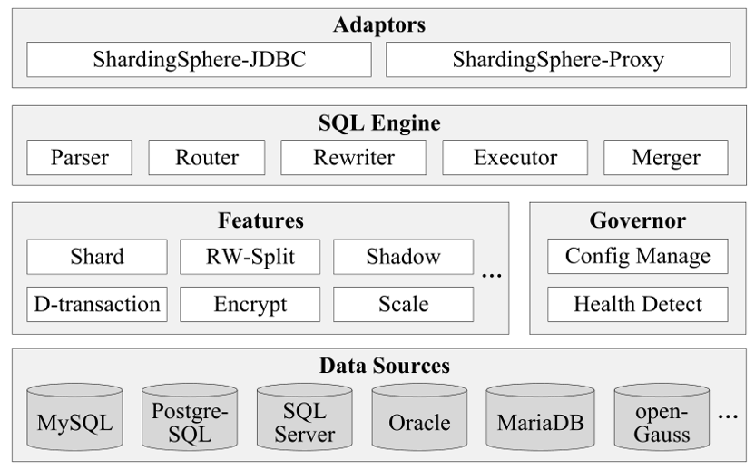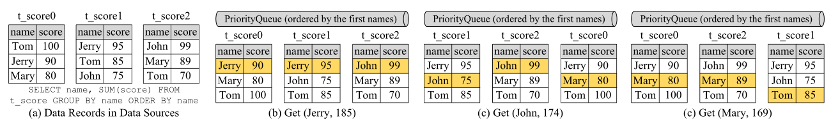 准备阶段。在此阶段,我们首先按数据源对路由和重写结果进行分组。然后,我们根据每个数据源的连接情况确定它们的连接方式。如果路由到数据源的 SQL 数量大于数据源用于查询的最大连接数,就只能采用严格连接模式,否则,我们可以选择严格内存模式。接下来,我们获得所需的连接并创建执行单元。为了避免出现死锁,我们向数据源添加锁来自动获取查询所需的所有连接。执行阶段。在此阶段,将组中的执行单元一起发送到对应的底层数据源。数据源并行执行 SQL,并为分布式事务或监视发送事件消息。结果合并将来自不同数据源的多个结果集合并为一个,并将结果返回给用户应用程序。上文提到流合并和内存合并两种合并方式,对于不同的语句我们采用不同的合并方式。对于迭代语句我们采用流合并的方式,只需要将结果按照数据库游标逐一合并。对于排序(Order by)语句而言,因为每个数据源返回的结果集是有序的,我们采用流合并来使用多路合并算法将这些结果集合并为一个结果集。如果语句同时包含 GROUP BY 和 ORDER BY,并且 GROUP BY 和 ORDER BY 的属性相同,则可以使用流合并。因为组中的数据记录都位于游标所指向的第一位置,如图 10,我们从左到右扫描指向的数据记录(标记为橙色)并累积分数,直到名字不是“Jerry”,输出“Jerry,185”后,调整数据库游标并重复上述操作。其他情况我们需要使用内存合并。此外我们还可以将流合并和内存合并用于聚合语句以及分页操作。ShardingSphere 包含两个适配器:ShardingSphere-JDBC 和 ShardingSphere-Proxy。前者可以被视为增强的 JDBC 驱动程序。它封装了整个 SQL 引擎和 ShardingSphere 提供的其他功能,可以在任何使用 JDBC 的地方使用。后者是一个代理服务器,它将来自应用程序的请求转发到数据源。它提供了一个连接池,因此不同的应用程序和不同的查询可以共享同一连接。ShardingSphere-Proxy 将自己伪装成 MySQL 或 PostgreSQL 数据库。所以它对应用程序开发人员是透明的,并且支持任何编程语言。现在全世界已经有许多地方在使用 ShardingSphere 系统比如京东白条、中国电信翼支付等。ShardingSphere 提高了服务质量,降低了开发成本。数据集:1)Sysbench,这是一个著名的数据库基准测试工具,它提供了一个表格,允许用户调整其数据量。2)TPCC,一个广泛使用的 OLTP 基准,它模拟了商店经常使用的几种交易类型。它的 10 个表按仓库组织(每个仓库约 600,000 个条目)。对比方法:MySQL v5.7.26(MS);PostgreSQL v10.17(PG);Vitess v12.0.0;Citus v9.0.0;TiDB v5.2.0;CockroachDB v21.1.11(CRDB);Aurora MySQL v2.07.2;Aurora PostgreSQL v4.2。我们在华为云中使用了一个由 12 台虚拟服务器组成的集群,每台服务器都配备了 CentOS 7.1 64 位、32-VCORE CPU、64 GB 内存和 1TB 磁盘。对比实验。使用 Sysbench 进行比较,如下表所示,基于 ShardingSphere 的系统在所有场景中总是表现最好的。