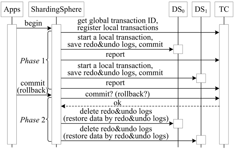 结合图 1 和图 4 我们来解释数据分片中的一些概念:图 1 中的 uid 用来确定数据分片的字段,称其为分片键。ShardingSphere 支持多字段分片键。图 1 中“uid%2”用来将数据记录分配给不同的表,我们称其为分片算法。ShardingSphere 中包含十余种内置分片算法,用户也可以通过接口进行自定义算法。ShardingSphere 还为不同的数据分片需求提供了不同类型的表。例如上图的 t_user,我们称其为逻辑表,而 t_user_h0,t_user_h1 为实际表。真正存储在数据库中的表是实际表,但是应用程序开发人员所看到的表是未经分片的逻辑表。对于应用程序开发人员来说分片操作是透明的。如果在图 4(c)中,如果 t_user 和 t_order 采用相同的分片算法、相同的数据源、相同的分片键和相同的分片算法,我们称它们表为绑定表,这在关联查询时十分有用。此外,我们使用数据节点将逻辑表映射到实际表。它是分片的原子单位,由一个数据源名称和一个实际的表名组成,例如,DS0.t_user_h1。ShardingSphere 为不同的使用场景提供了三种类型的分布式事务。XA 事务。原生 XA 事务共有三个角色:AP、RM、TM,开发人员如果要使用 XA 事务,会有较大的学习成本。ShardingSphere 扮演了 AP 和 TM 的角色,因此开发人员能够像使用单机版事务一样使用 XA 事务。如下图 5,当应用程序向 ShardingSphere 发送“提交”请求,ShardingSphere 将记录日志并启动 2PC(两阶段提交)过程:第一阶段,ShardingSphere 向所有数据源发送“准备”消息,以检查该事务是否可以提交。如果一个数据源确定可以提交它自己的事务,它会向 ShardingSphere 发送一个“ok” ;否则,它会发送一个“no”,并回滚它所做的事情。若所有数据源都“ok”,ShardingSphere 则向所有数据源发送“commit”,否则发送“Rollback”通知回滚。数据源根据命令进行操作。XA 事务保证了数据的 ACID 特性,但是因为会锁定资源,不太适合长时间事务,ShardingSphere 提供了本地事务和 BASE 事务来解决此问题。本地事务。如图 6,当 ShardingSphere 接收来自用户应用程序的“COMMIT”或“ROLLBACK”命令时,它会直接把该命令传输到所有数据源。即使某些数据源提交失败,ShardingSphere 也会忽略它。因为 Local 事务没有准备阶段,故可以提高效率。
