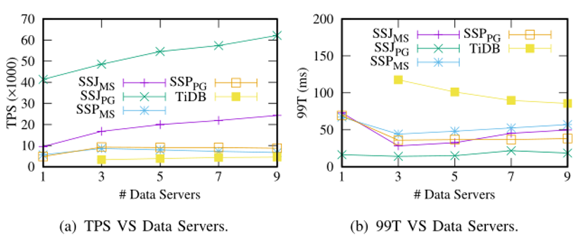 可伸缩性实验。接下来我们只与 TiDB 进行对比,因为它相比于别的系统性能最优。如图 12,基于 SSJ 的系统总是执行得最好。