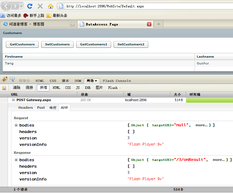 要查看AMF数据,切换到“网络”标签,然后再找到有关Remoting网关请求的地址(一般请求地址包含Gateway字符串,我的例子是使用了FluorineFx开源.NET网关的一个现成例子),点击展开,如下图: